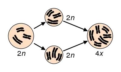- El origen de una raza tetraploide a partir de una diploide requiere la ocurrencia de dos poliploidizaciones: una de un macho y una de una hembra, así como su posterior apareamiento, siendo muy improbable que esto ocurra.