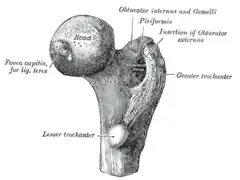 ![]() Extremidad superior del fémur derecho visto desde atrás. Son visibles la cabeza del fémur (head), el cuello anatómico (neck), trocánter mayor (greater trochanter) y trocánter menor (lesser trochanter). | ||