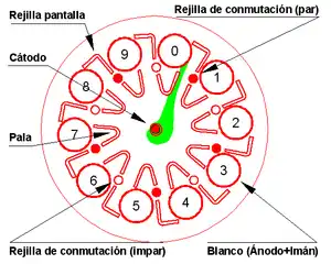 El cátodo está en el centro, rodeado por 10 electrodos diana. Entre el cátodo y cada diana se dispone un electrodo en forma de "J", llamado pala (spade). Próximos a ellos se sitúan otros electrodos planos, llamados "rejillas". Las rejillas se conectan alternadamente, formando dos grupos: "par" e "impar".