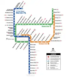 | Línea Verde | 2005 | 27 | 23,6 mi (37,98 km) | Santee Town Center 12th & Imperial Transit Center |