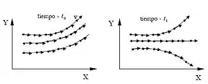 Aquella familia de curvas que para, cada instante de tiempo, representan las envolventes del campo de velocidades. En mecánica de fluidos se denomina línea de corriente al lugar geométrico de los puntos tangentes al vector velocidad de las partículas de fluido en un instante determinado. En particular, la línea de corriente que se encuentra en contacto con el aire, se denomina línea de agua.
