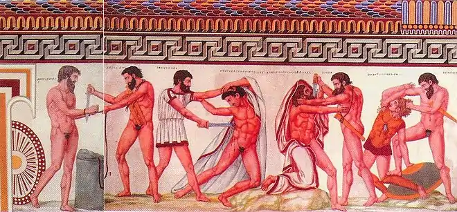 - Agamenón, Patroclo, Vanth, Aquiles, Prisionero troyano, Charun, Áyax Telamonio, Prisionero troyano, Áyax el Menor y prisionero troyano (Tablinum, pared oeste)