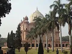 El gran jardín cuadrado que rodea la tumba está rodeado por un muro de aproximadamente 280 m de lado.[12] El diseño tiene la forma de cuatro cuadrados con senderos anchos y estanques de agua, que se han subdividido en cuadrados más pequeños. El jardín es del tipo chahar bagh, el estilo más apreciado por los mongoles, y es una versión reducida del jardín de la tumba de Humayun, que se había construido en Delhi hacia ya casi dos siglos. Un canal conduce a la puerta de entrada y el otro conduce a los tres pabellones. El podio principal sobre el que está construido el mausoleo mide 50 m de lado.[12] Los altos muros han sido construidos con mampostería de piedra y tienen arcos empotrados en el interior. Las torres o chatris son de forma octogonal. Su diseño general consta de cuatro pabellones que tienen múltiples cámaras y la puerta de entrada al este es impresionante. En el lado este, contiguo a la puerta, hay muchos apartamentos, una mezquita y un patio. Los pabellones están dispuestos en las direcciones oeste, norte y sur y se denominan Jangli Mahal (palacio en el bosque), Moti Mahal (palacio de perlas) y Badshah Pasand (el favorito del rey), respectivamente. La familia del nawab solía residir en estos pabellones. Ahora todo el monumento está bajo el control del ASI, que tiene sus oficinas en los pabellones y también una biblioteca sobre la puerta principal.[13]