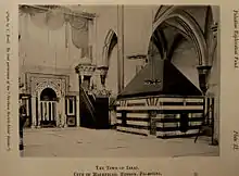 “Todos los sepulcros de los patriarcas están cubiertos de ricas alfombras de seda verde, hermosamente bordadas en oro; las de las esposas son rojas, bordadas de la misma manera. Los sultanes de Constantinopla suministran estas alfombras, que se renuevan periódicamente." Ali Bey contó nueve, una sobre otra, en el sepulcro de Abraham.