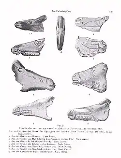 Más importante todavía que el "peinador", de cara a la adscripción espaciotemporal de la tumba a un periodo determinado, resultó ser la segunda ofrenda, con la que ya en 1914 se podían trazar paralelismos con otros hallazgos. "Esta talla en hueso", escribía Verworn, "es una de aquellas pequeñas y estrechas cabezas de caballos de aspecto tabliforme, talladas por ambos lados y parecidas a las encontradas por Girod y Massenad en Laugerie Basse y por Piette en los Pirineos, en número y variedad mucho mayor y que representan el fósil característico del Magdaleniense inferior.".[6] En la pieza, que medía tras su recomposición 8,5 cm de largo, 3,5 de ancho y aproximadamente 1 cm de grosor, veía Max Verworn una de aquellas cabezas provenientes de ese periodo.