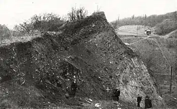 Delante de las instalaciones de la cantera existía un escarpado desplome, creado por las labores de desmonte en la cantera. Al pie del desplome se encontraba el lugar del descubrimiento, a unos 99 metros sobre el nivel del mar. No se efectuó el trazado cartográfico del yacimiento, pero el geólogo bonaerense, Gustav Steinmann, realizó una descripción del lugar. La capa superior, de unos 50 centímetros de grosor, consistía en escombro de la cantera y una cubierta de humus. Debajo, unos 6 metros de materiales del desplome compuesto de bloques de basalto más o menos erosionado, mezclado con arcilla basáltica. No existían capas de material poroso bajo o sobre el yacimiento, pero sí arenisca de cuarzo, que se había ido desprendiendo o había sido arrastrada por las aguas desde la terraza principal, a la altura del Kuckstein.[1]