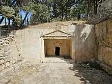 El amplio patio de entrada se construyó a partir de una antigua cantera, con cuevas funerarias excavadas en la roca adyacente y bancos de piedra tallados en la roca de enfrente para servir a los visitantes. El portal del recinto está ligeramente alzado por encima del suelo del patio, formando un peldaño.[11] La fachada de la tumba habría tenido un aspecto un tanto distinto en la época medieval; un informe del siglo XIII describe una «hermosa estructura» que contiene «cuevas dentro de cuevas», y un dibujo de 1659 muestra una gran columnata arqueada en la entrada.[11]