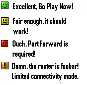 Si usted ve roja la cara triste entonces Tunngle detecta que un Port Forward se requiere con el fin de optimizar la conectividad (sin que usted debería ser capaz de conectar con la gente que tiene un smiley verde). Si usted es un usuario de cable o si usted no tiene un enrutador se puede tratar de ponerse en contacto con su proveedor de servicios de Internet Soporte para preguntar si se puede abrir el puerto para usted. Por favor, compruebe también que el Tunngle ejecutables están permitidos en su Antivirus y Firewall.
