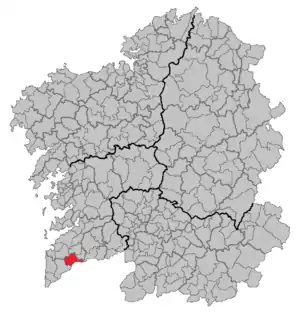 Integrado en la comarca de Bajo Miño, de la que ejerce de capital, se sitúa a 52 kilómetros de la capital provincial. El término municipal está atravesado por la Autopista del Atlántico (AP-9), por la autovía A-55 (Vigo-Tuy), por la carretera provincial PO-552, que se dirige hacia La Guardia, y por carreteras locales que conectan con Salvatierra de Miño, Salceda de Caselas, Gondomar y Tomiño.