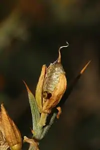 Fruto tipo legumbre oblonga u obovada, 10,5-13 x 3,5-4 mm, tan largo como el cáliz o algo más largo, con 1-4 semillas. Semillas 2,1-2,8 x 1,7-2,1 mm.