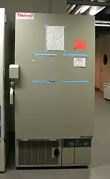 - Esta obra contiene una traducción derivada de «ULT freezer» de Wikipedia en inglés, publicada por sus editores bajo la Licencia de documentación libre de GNU y la Licencia Creative Commons Atribución-CompartirIgual 4.0 Internacional.