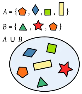 La unión de conjuntos se denota por el símbolo , de modo que por ejemplo: