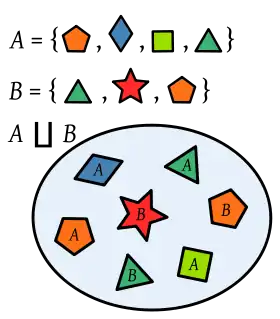 En general, dados dos o más conjuntos no necesariamente disjuntos estos pueden unirse de mediante una operación similar a la unión, salvo que se ignora el hecho de que los elementos repetidos solo deben aparecer una vez. Esta operación se denomina también su unión disjunta.