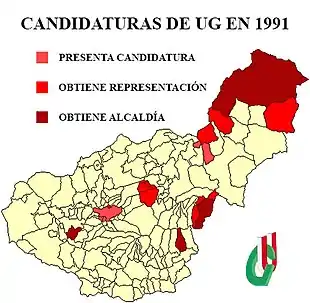 | 1 A las elecciones municipales de 1995 la formación no presenta ninguna candidatura, y queda completamente inactiva. | ||