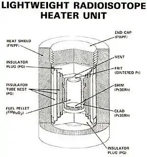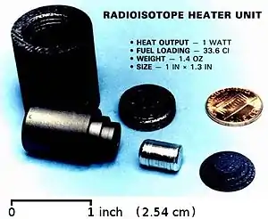 Una unidad de calor de radioisótopos es un pequeño dispositivo de suministro de calor mediante decaimiento radiactivo. Es similar a un generador termoeléctrico de radioisótopos, pero es diminuto y de ordinario proporciona aproximadamente un vatio de calor liberado por el decaimiento de unos pocos gramos de plutonio-238 que se convierten en dióxido (234U O2), si bien es factible el mismo resultado con el empleo de otros isótopos radiactivos. Las especificaciones regulares de la NASA indican dos cilindros, cada uno de ellos con una pila de dióxido de plutonio, protegidos por una carcasa cuyo material es resultado de la aleación de platino y rodio; el conjunto tiene una masa de unos 40 g, un diámetro de 2,6 cm y una altura de 3,2 cm. Se puede disponer de calor durante décadas y, al menos teóricamente, durante algo más de un siglo.[1]