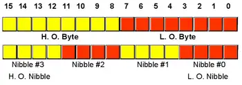 Un byte consta también de 2 nibbles; los bits 0, 1, 2 y 3 forman el llamado nibble de menor orden, y los bits 4, 5, 6 y 7 forman el nibble de mayor orden. Como un byte está formado por exactamente dos nibbles, es posible representar cualquier valor con dos dígitos hexadecimales.