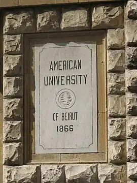La Universidad Americana de Beirut[2] (ar: الجامعة الأميركية في بيروت / en: American University of Beirut (AUB))[3] es una universidad privada, secular e independiente cuya sede principal se encuentra en Beirut, capital de Líbano. Los títulos otorgados por esta universidad son reconocidos por la Universidad Estatal de Nueva York[3] y la institución es, según QS World University Rankings, la mejor universidad de Líbano, la 2º de los países árabes[4] y la 228° del mundo, según el "QS world university rankings".[5] Fue fundada el 3 de diciembre de 1866 por Daniel Bliss, misionero protestante de la American Board of Commissioners for Foreign Missions, con el nombre de Colegio Protestante de Siria, denominación oficial que conservó hasta 1920.[3]
