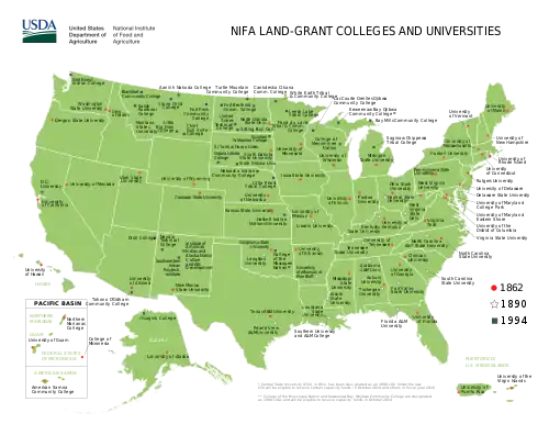 Aprobada por Abraham Lincoln, la primera Ley Morrill comenzó a financiar las instituciones educativas mediante la concesión federal de tierra a los estados para que las pudiesen vender, o utilizar para recaudar fondos, con el objetivo de establecer y dotar de fondos a las universidades públicas que se pudiesen acoger a éstas subvenciones. La misión de estas universidades, como se establece en la Ley de 1862, es centrarse en la enseñanza de la agricultura práctica, ciencias, ciencia militar e ingeniería (aunque «sin excluir ... los estudios clásicos») como respuesta a la revolución industrial y el cambio clase social.[2][3] Esta misión contrastaba con la práctica histórica de la educación superior de centrarse en un plan de estudios de artes liberales. Una expansión de 1994 otorgó el estatus de concesionarias de tierras a varias universidades tribales.[4]