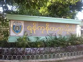 La Universidad de Yangon (también Universidad de Yangon ; birmano: ရန်ကုန် တက္ကသိုလ် ; anteriormente Rangoon College , Universidad de Rangoon y Universidad de Artes y Ciencias de Rangoon ), ubicada en Kamayut, Yangon, es la universidad más antigua del sistema educativo moderno de Myanmar y la universidad más conocida de Myanmar. La universidad ofrece principalmente programas de licenciatura y posgrado (licenciatura, maestría, diploma de posgrado y doctorado) en artes liberales , ciencias.y ley . Los títulos de licenciatura a tiempo completo no se ofrecieron en el campus principal de la universidad después de las protestas estudiantiles de 1996. La licenciatura se volvió a ofrecer a partir de 2014 a los mejores estudiantes del país. Hoy en día se ofrecen títulos en Ciencias Políticas a estudiantes de pregrado, así como diplomas de posgrado en áreas como trabajo social y geología.