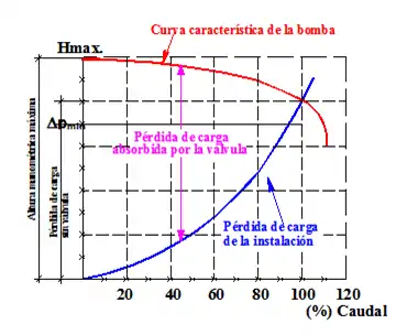 Suponiendo un circuito formado por una bomba centrífuga, una válvula de control y la tubería correspondiente. Los parámetros de la bomba y la pérdida de carga absorbida por el sistema, varían según el grado de apertura de la válvula. En cada momento, la diferencia entre la altura manométrica de la bomba y la pérdida de carga de la tubería al variar el caudal, corresponde a la pérdida de carga absorbida por la válvula, que aumenta al disminuir el caudal.