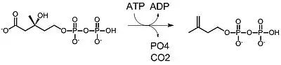 | Mevalonato-5-pirofosfato descarboxilasa | ![]() | Mevalonato-5-pirofosfato se descarboxila para producir isopentenil pirofosfato (IPP) (pirofosfato de isopentilo). Se consume 1 ATP. |
