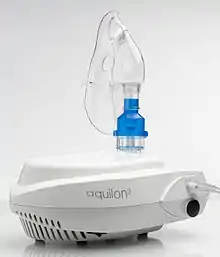 - Inhaladores. Existen los clásicos, en los que un pequeño tanque con el fármaco micronizado es presionado con la base para expulsar la dosis exacta del medicamento. Cada medicamento con dispositivo inhalador posee un instructivo de uso debido a que la forma de uso puede diferir entre marcas. Las nuevas generaciones de dispositivos permiten una dosificación más precisa, como los Turbuhaler®, Aerolizer®, Oxis®, etc.[5]