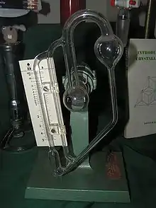- v: el volumen del gas una vez comprimido, cuando el Hg en el capilar de comparación se enrasa con la línea de cero,