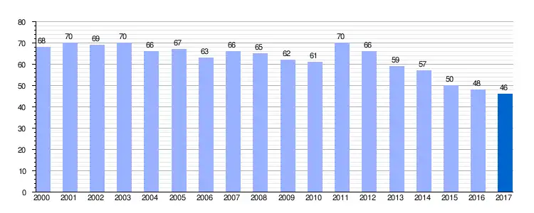 | Gráfica de evolución demográfica de Valdecolmenas de Abajo entre 2000 y 2017 |