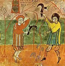 - "En la Valdecuriada, usan como abrigo la renombrada anguarina de mangas anchas, con una tira de paño á la cintura, lo que les dá cierta semejanza con los levitones rusos. Los pastores y muchos labradores de esta zona, que tienen que permanecer mucho tiempo á la intemperie, llevan capa de lana blanca, con capuchó n de la misma materia. Vistos á cierta distancia, se asemejan á los tipos ái'abes y marroquíes. Las mujeres de estas dos última s zonas, así como las de la Montañ a de Guardo, se dedican á las rudas faenas del campo, y visten manteos gordos confeccionados con las lanas del país, a los que colorean de azulcon el añil, otiñen de amarillo por medio de la gualda. Todos los habitantes de este país, sin excepción de categorías, sexo , ni clase, usan en invierno un calzado de madera que denominan almadreñas ó albarcas. La s principales diversiones populares, consisten en los juegos de bolos y barra, y en lo que llaman aluche; bárbaro entretenimiento que aun cuando denota virilidad en la raza, denuncia á la legua falta de instrucción y cultura en el pueblo, y poquísimo celo en las autoridades que lo consienten y fomentan."