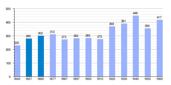 | Gráfica de evolución demográfica de Valldán[2] entre 1842 y 1960 |