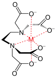 El ácido etilendiaminotetraacético (EDTA o AEDT), tiene cuatro grupos carboxilo y dos grupos amino que pueden actuar como donantes de pares de electrones, o bases de Lewis. La capacidad del EDTA para potencialmente donar hasta sus seis pares de electrones libres, para la formación de enlaces covalentes coordinados, a los cationes metálicos hace del EDTA un ligando hexadentado. Sin embargo, en la práctica el EDTA está, por lo general, sólo parcialmente ionizado, y por lo tanto forma menos de seis enlaces covalentes coordinados con los cationes metálicos.
