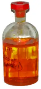 - Dicromatometría: El agente oxidante es el ion dicromato, Cr2O72- que se reduce a cromo (III), en medio ácido.[5] Se emplea para valorar disoluciones de hierro (II), sodio o uranio. Sus disoluciones son muy estables. Se emplea difenilaminosulfonato de bario como indicador. Un ejemplo es: