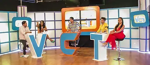 ![]() Set del programa en 2014 con Emilio Pinargote, Denisse Angulo, Oswaldo Segura (centro), Jorge Heredia y Adriana Sánchez. | ||