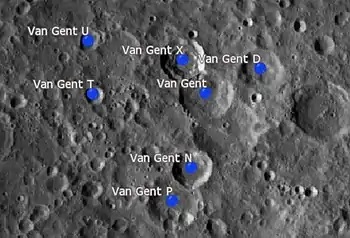 Por convención estos elementos son identificados en los mapas lunares poniendo la letra en el lado del punto medio del cráter que está más cercano a Van Gent.