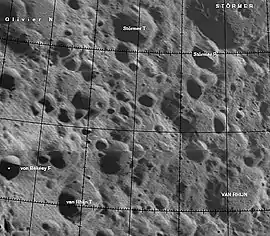 Por convención estos elementos son identificados en los mapas lunares poniendo la letra en el lado del punto medio del cráter que está más cercano a Van Rhijn.