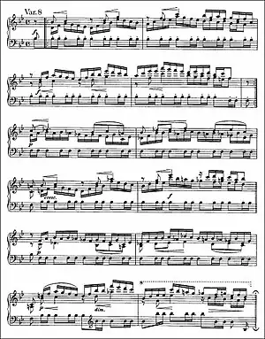 La Variación 8 continúa la excitación rítmica de la Variación 7, la mano izquierda golpea, en la misma nota una y otra vez, el mismo ritmo anapéstico que la variación anterior. Después de unos compases, las dos voces de la mano derecha se invierten. Una fermata al final proporciona un momento de silencio antes de que comience la variación 9 y señala el final de la primera sección.