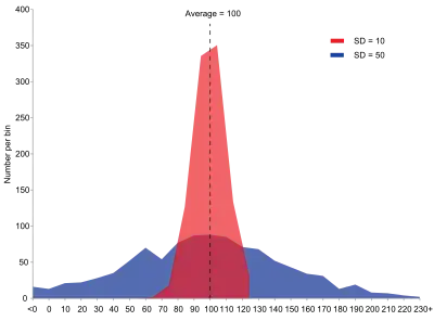 Ejemplo de muestras de dos poblaciones con la misma media pero varianzas diferentes. La población roja tiene media 100 y varianza 100 (DE=10) mientras que la población azul tiene media 100 y varianza 2500 (DE=50).