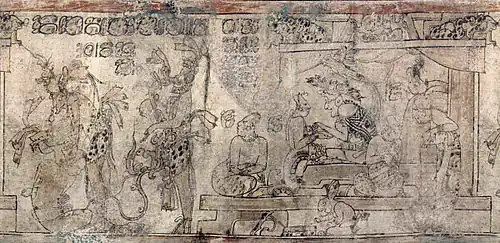 Abajo y sentado al lado del trono, un conejo antropomórfico (animal más frecuentemente asociado con el dios L) está escribiendo en un libro con cubiertas de piel de jaguar, tal vez para registrar la escena frente al trono: Dos hombres de pie con elaboradas máscaras y empuñando hachas proceden a decapitar a un hombre sentado maniatado cuyo atributo de serpiente sinuosa, acosada por ojos de muerte, es propio de los escribas, o en todo caso, de los funcionarios para quienes el arte de escribir era esencial. [3] Uno de los dos hombres muestra los rasgos del dios del viento; el otro lleva una máscara de verdugo con una nariz de garra de jaguar.