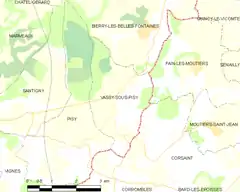 - Situación de Vassy en un mapa de Francia y de comunas limítrofes (en francés)