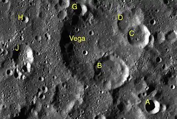 Por convención estos elementos son identificados en los mapas lunares poniendo la letra en el lado del punto medio del cráter que está más cercano a Vega.