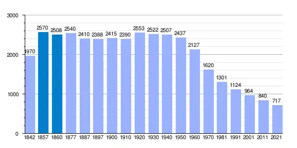 | Gráfica de evolución demográfica de Vega de Liébana[10] entre 1842 y 2021 |