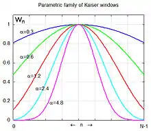donde I0 es la función de Bessel modificada de primer tipo de orden cero, α es un número real arbitrario que determina la forma de la ventana y n es un número natural que determina el tamaño de la ventana.