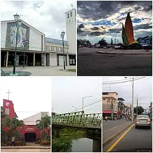 ![]() De izquierda, Iglesia del Sagrado corazón de Jesús, Monumento al maíz, iglesia de Nuestra Señora de Guadalupe, Puente sobre el río Zapotal, Centro de la ciudad.