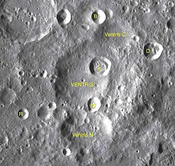 Por convención estos elementos son identificados en los mapas lunares poniendo la letra en el lado del punto medio del cráter que está más cerca de Ventris.