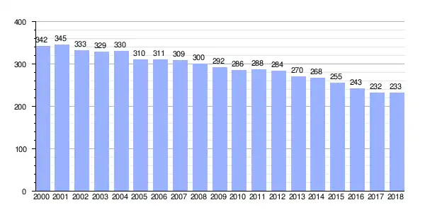 | Gráfica de evolución demográfica de Verines[2] entre 2000 y 2018 |
