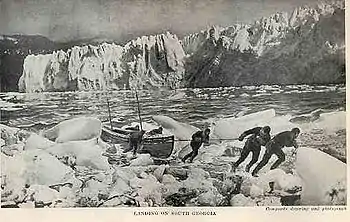 El 15 de mayo, navegaron con el James Caird unos 50 km hasta el fondo de la bahía, desembarcaron en una playa que sería su refugio y a la que bautizaron como "Peggotty Camp" (por la casa flotante de Peggoty en la novela de Charles Dickens David Copperfield).[38] Muy temprano, el 18 de mayo, los tres iniciaron el que sería el primer cruce por tierra confirmado de la isla Georgia del Sur.[39] El viaje estaba lejos de ser fácil, ya que carecían de mapa y tuvieron que improvisar una ruta a través de una cadena montañosa con glaciares. Sin equipo apropiado, viajaron sin descanso durante 36 horas, hasta llegar a su destino en Stromness. Al llegar parecían, en palabras de Worsley, "tres horribles espantapájaros",[40] con el rostro demacrado, ennegrecidos por el humo de la grasa, con las marcas dejadas por su exposición al viento helado y con congelaciones.[41] Más tarde esa noche del 19 de mayo, un barco de motor fue enviado a la bahía del Rey Haakon para recoger a los tres hombres, McCarthy, McNish y Vincent, y al James Caird.[42] Worsley escribió que todos los marinos noruegos en Stromness quisieron tener el honor de portar a hombros el bote desde el muelle hasta un almacén en que lo guardaron, todo un gesto lleno de afecto.[43]