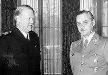 Por los siguientes nueve meses, Quisling continuó liderando un partido que era, en el mejor de los casos, periférico en la política noruega;[69] sin embargo, estuvo activo y en octubre de 1939 trabajó con Prytz en un plan que resultó infructuoso para la paz entre Gran Bretaña, Francia y Alemania, y su eventual participación en una nueva unión económica. Quisling también reflexionó sobre cómo Alemania debía pasar a la ofensiva contra su entonces aliado, la Unión Soviética, y el 9 de diciembre viajó a Alemania para presentar sus planes multifacéticos.[70] Tras impresionar a los oficiales alemanes, obtuvo una audiencia con el propio Hitler, programada para el 14 de diciembre. Sus contactos le habían dado firmes consejos de que lo más útil que podía hacer era pedir ayuda a Hitler para un golpe de Estado proalemán en Noruega,[Nota 3] que permitiría a los alemanes usar a Noruega como una base naval. Después, la neutralidad oficial noruega sería mantenida por el mayor tiempo posible y, finalmente, el país caería bajo control alemán antes que británico. No está claro cuánto entendió el propio Quisling acerca de las implicaciones tácticas de tal medida o cuánto confió en su futuro ministro del Interior, Albert Hagelin, quien hablaba fluidamente alemán, para presentar los argumentos relevantes a los oficiales alemanes en Berlín durante las conversaciones previas a la reunión con Hitler, a pesar de que Hagelin, a veces, era propenso a exageraciones perjudiciales.[72] Casi seguramente, Quisling y sus contactos alemanes quedaron con diferentes puntos de vistas en cuanto a si habían acordado la necesidad de una invasión alemana.[73]