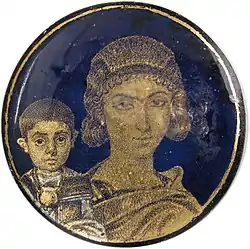 El vidrio de oro o vidrio de pan de oro es una tipología de vidrio de lujo donde se fusiona un diseño decorativo de pan de oro entre dos capas de vidrio. A pesar de que las primeras muestras se encuentran en la Grecia helenística, es característico del vidrio romano de finales del Imperio Romano, entre los siglos III y IV , cuando el oro decoraba los bordes de copas y otros enseres. Muchas de estas piezas decoraban las paredes de las catacumbas de Roma, donde servían de hitos indicativos de los puntos donde se encontraban enterrados los cuerpos. Se han recuperado unas 500 piezas de vasos de oro que tenían esta función.[2] Los objetos completos de este tipo son extraños. Algunos muestran imágenes religiosas cristianas, mientras que otros se centran en la religión tradicional grecolatina, con varios desarrollos en el culto, y todavía hay algunos de carácter judío. Finalmente, también hay los que muestran imágenes de sus propietarios, y los más elaborados “se encuentran entre las representaciones más realistas provenientes de las primeras comunidades cristianas. Miran al espectaador con una claridad extraordinaria y una intensidad melancòlica ".[3] A partir del siglo I, esta técnica también fue utilizada como color dorado para la producción de mosaicos.