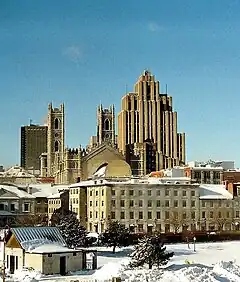 Lo mismo puede decirse de los edificios institucionales, como el Antiguo Palacio de Justicia, la Aduana, la Bonsecours mercado e incluso de la Basílica de Notre-Dame, cuya fachada es obra de un protestante irlandés de New York, James O'Donnell. La única excepción notable es el Ayuntamiento de Montreal, inspirado en el Hotel de Ville de Rennes. En comparación con construcciones de piedra se practica en virtud de los campos francés, el estilo victoriano que se necesita en la segunda mitad del siglo XIX altera el aspecto del casco antiguo de Montreal.