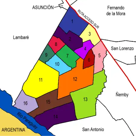 Vista del Municipio de Villa Elisa dentro del Departamento Central. (Pulse para ver mapa) | ||